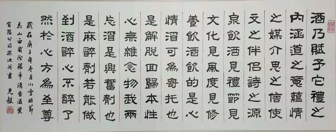 汾陽(yáng)市清香酒業(yè)有限公司座落在中華名酒第一村---杏花村申明亭路9號(hào)?!斗诰魄分杏涊d,申明亭畔新淘井,水重依稀亞蟹黃 ,注解說(shuō):申明亭井水絕佳,以之釀酒,斤兩獨(dú)重。明末愛(ài)國(guó)詩(shī)人、書(shū)法家和醫(yī)學(xué)家傅山先生,曾為申明亭古井親筆題寫(xiě)了得造花香四個(gè)大字,說(shuō)明杏花井泉得天獨(dú)厚,釀出的美酒如同花香沁人心脾。 汾陽(yáng)市清香酒業(yè)有限公司出品的清香型高端白酒用的是優(yōu)質(zhì)高粱、大麥和豌豆等上等原料和申明亭地下礦泉水,再加上杏花村土壤和空氣中獨(dú)有的菌群,在杏花村釀酒匠人的傳統(tǒng)工藝下精心釀造:清蒸二次清,固態(tài)地缸分離發(fā)酵,清字當(dāng)頭,一清到底,釀出的酒:酒液晶亮、清香幽雅、醇凈柔和、回甜爽口、飲后余香,在國(guó)內(nèi)外享有盛譽(yù)。